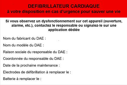 A coller à proximité immédiate du DAE (Défibrillateur Automatisé Externe) ou sur son boîtier.